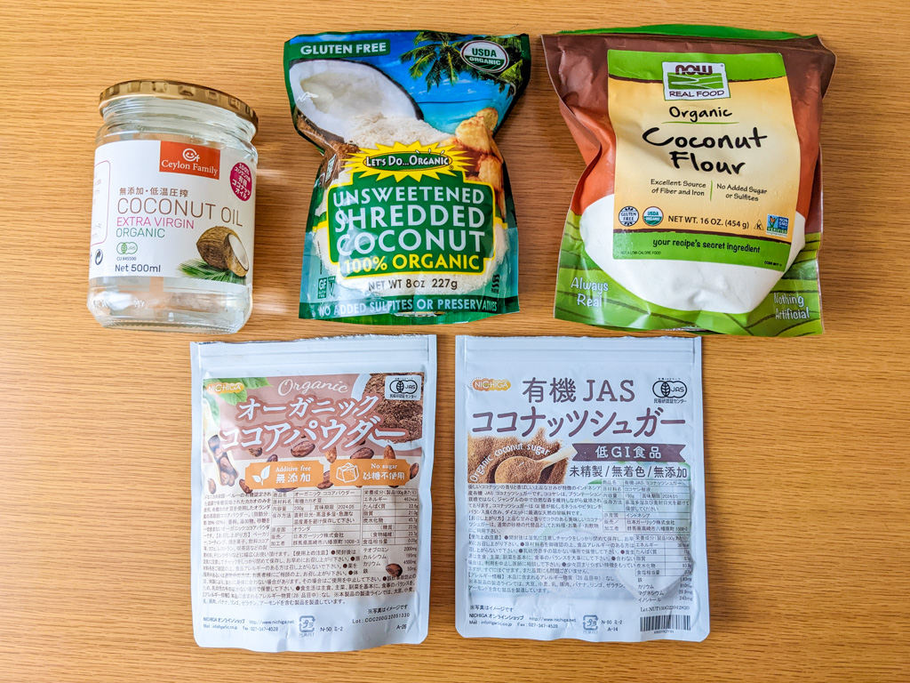 ココアパウダーとココナッツシュガーは、個人的にイチ推しショップのニチガで買いました(※ココナッツシュガーは現在取扱なし)